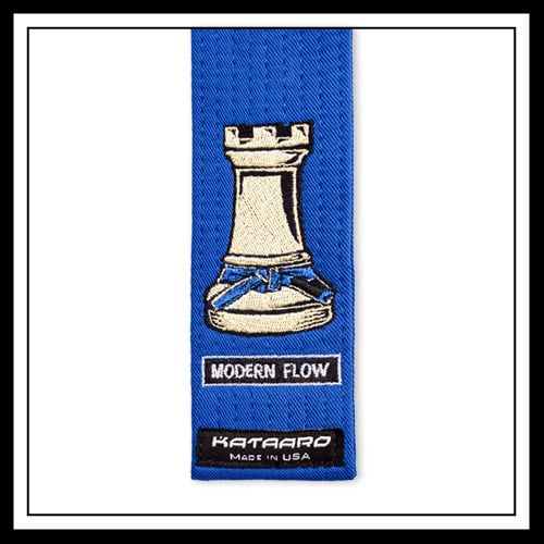 A masterpiece collaboration commissioned by Modern Flow Brand with artwork designed by Meerkatsu. Each color belt has a unique chess piece design. This 1-3/4 inch wide jujitsu rank belt is available in standard BJJ colors. Construction is 100% twill cotton with a single strapping cotton core. The color rank belts have a black 4-1/2 inch rank sleeve on one end, which starts 1 inch from the belt end. The black belt rank sleeve is red and 7 inches long, with 3/4" white instructor stripes on each end. White 1/2 inch rank stripes can be added. Stripes are sewn on the sleeve with 1/8 inch spacing.