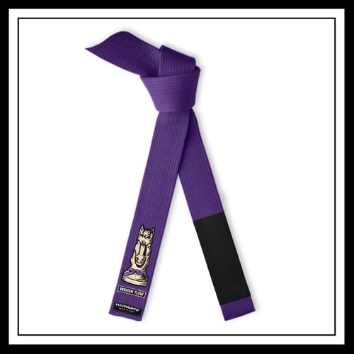 A masterpiece collaboration commissioned by Modern Flow Brand with artwork designed by Meerkatsu. Each color belt has a unique chess piece design. This 1-3/4 inch wide jujitsu rank belt is available in standard BJJ colors. Construction is 100% twill cotton with a single strapping cotton core. The color rank belts have a black 4-1/2 inch rank sleeve on one end, which starts 1 inch from the belt end. The black belt rank sleeve is red and 7 inches long, with 3/4" white instructor stripes on each end. White 1/2 inch rank stripes can be added. Stripes are sewn on the sleeve with 1/8 inch spacing.